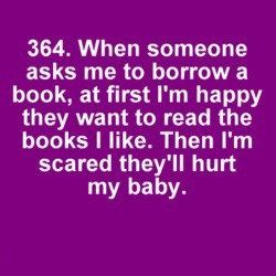 I don't like lending booksHmm… I don’t think I have many! I don’t turn down pages in books to mark my place, I don’t borrow physical library books so I don’t have lateness issues and I don’t crease or damage covers. I think my two bad bookish habits are buying far too many books therefore having a never-ending TBR list and I hate lending books out. I HATE it. If it’s a book I’m not overly fussed on I have no problems lending it out, but if it is a book I loved and want to keep, or part of a series, and you want to borrow it, you will have to pry it from my fingers because I hate lending books out. I’m lucky if I get it back, and on the occasions when I do it’s always been abused somehow. In fact, I would go and BUY a friend a copy of the book before I would lend them mine (and I have done this!). Abusing my poor books is just a friendship deal-breaker!