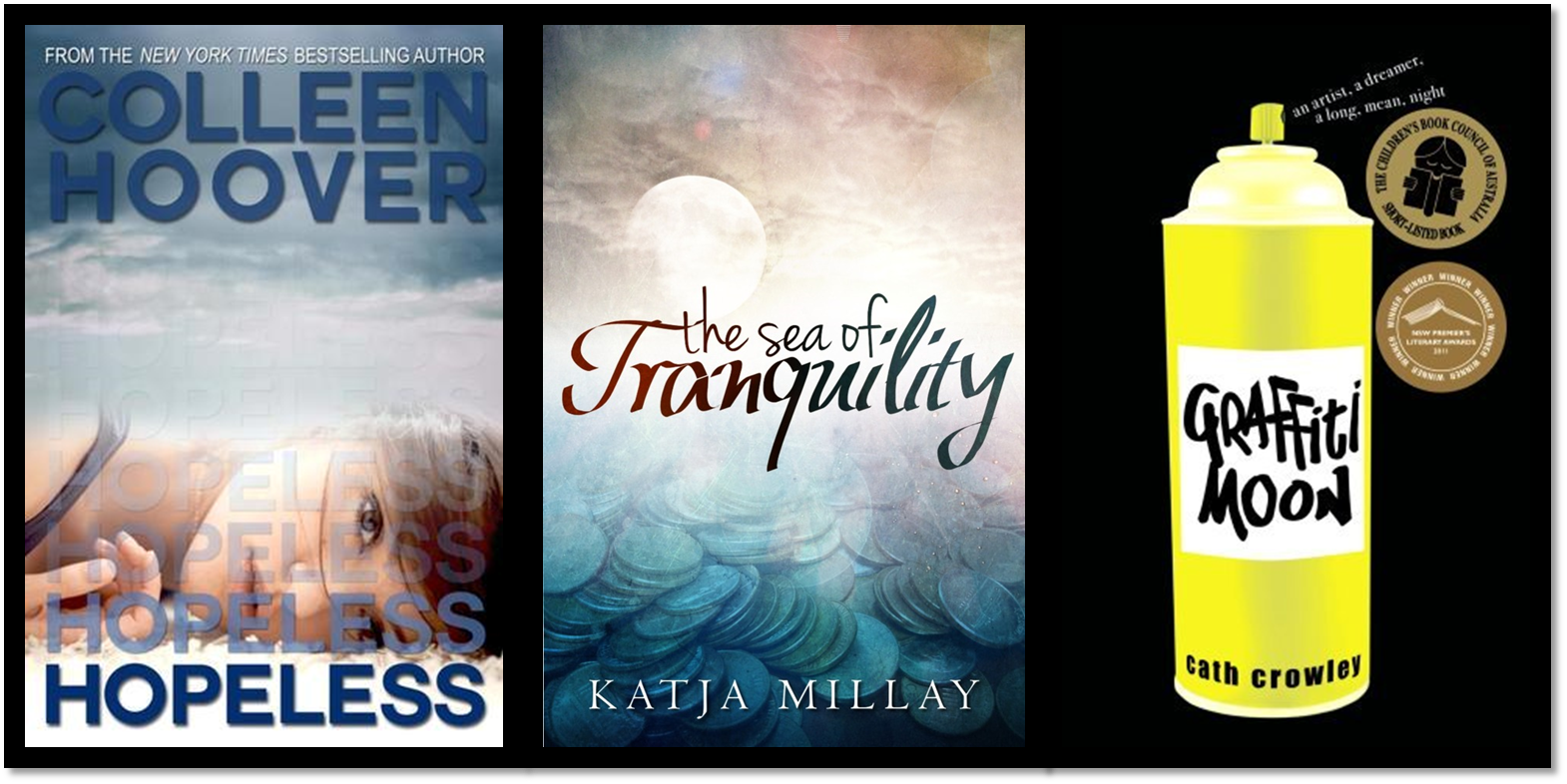 For my author and book information worksheet, I was asked to name at least two covers for books in my genre that I liked and why. I chose Colleen Hoover’s Hopeless and Katja Millay’s The Sea of Traquility (the self-published version), and Cath Crowley’s Graffiti Moon (with the yellow paint spray can). I wanted something more somber and abstract than a cute boy or couple on the cover.